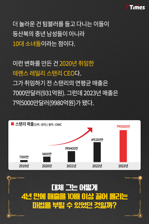 최근 미국에서는 '스탠리' 텀블러가 선풍적 인기입니다. 마치 액세서리처럼 옷차림에 맞춰 바꿔 들기 위해 각양각색의 텀블러를 모으는 사람들이 있는가 하면, 이 텀블러를 꾸미는 아이템들이 쏟아져 나오고 있죠. 100년 넘게 등산용 보온병 회사로 인식되던 스탠리를 MZ세대의 핫템으로 만든 사람은 2020년 스탠리 CEO에 취임한 테렌스 레일리인데요. 바로 '크록스'에서 마케팅최고책임자로 7년을 근무하며 세상에서 가장 못생긴 고무신을 세상에서 가장 인기 있는 신발로 바꿔놓은 사람입니다.