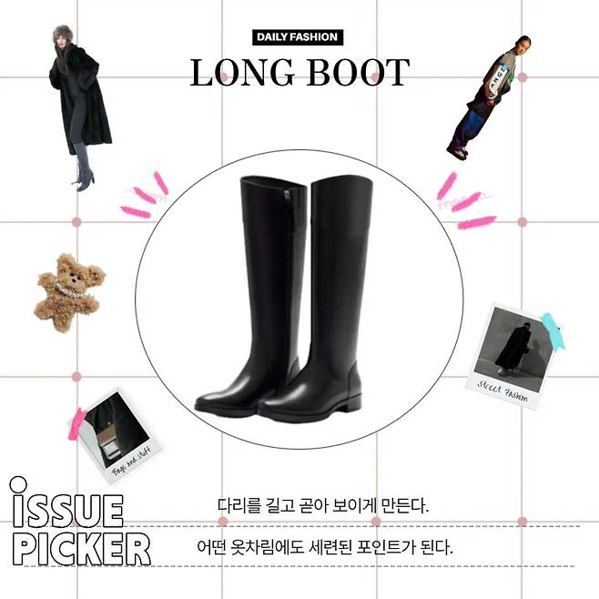 어떤 패션에 입어도 확실한 포인트가 되는 롱부츠는 장원영처럼 상의와 하의를 간결하게 구성하고 부츠로 포인트를 주면 전체적인 균형을 잡기 쉽다. 미니 원피스와 함께 입으면 다리 길이가 돋보이고 재킷을 더하면 간절기용 데일리룩으로 활용할 수 있다. 원피스와 부츠의 색상을 비슷하게 맞추면 자연스럽고 서로 다른 색상을 사용하면 눈에 잘 띈다.