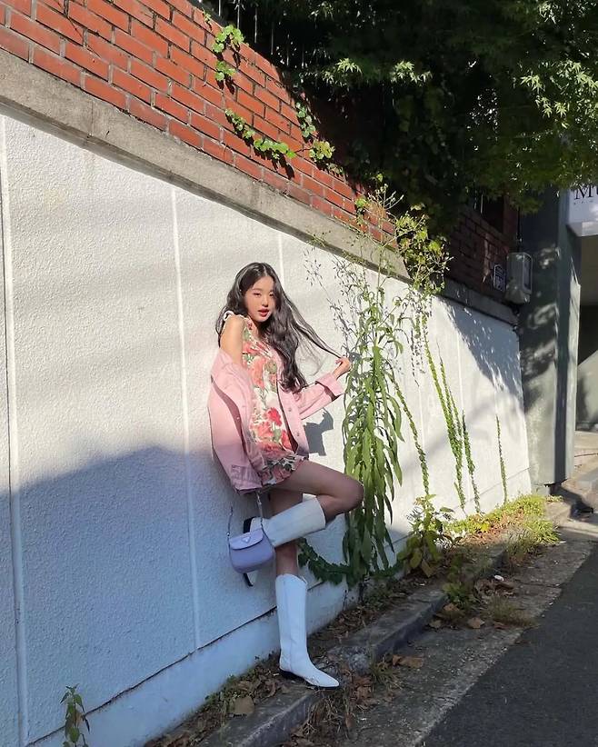 두 번째 착장은 플라워 원피스에 핑크 재킷, 화이트 롱부츠를 매치한 스타일이다. 화사한 색감의 원피스 위에 핑크 재킷을 걸쳐 상의에 포인트를 주고 부츠를 밝은 색으로 선택해 전체적으로 통일감을 줬다. 뾰족한 앞코 라인이 다리를 길어 보이게 만들고 미니백을 더해 비율을 정리했다. 해당 착장은 봄이나 초가을 날씨에 적합하며 주말 나들이나 가벼운 모임에 활용하기 좋다.
