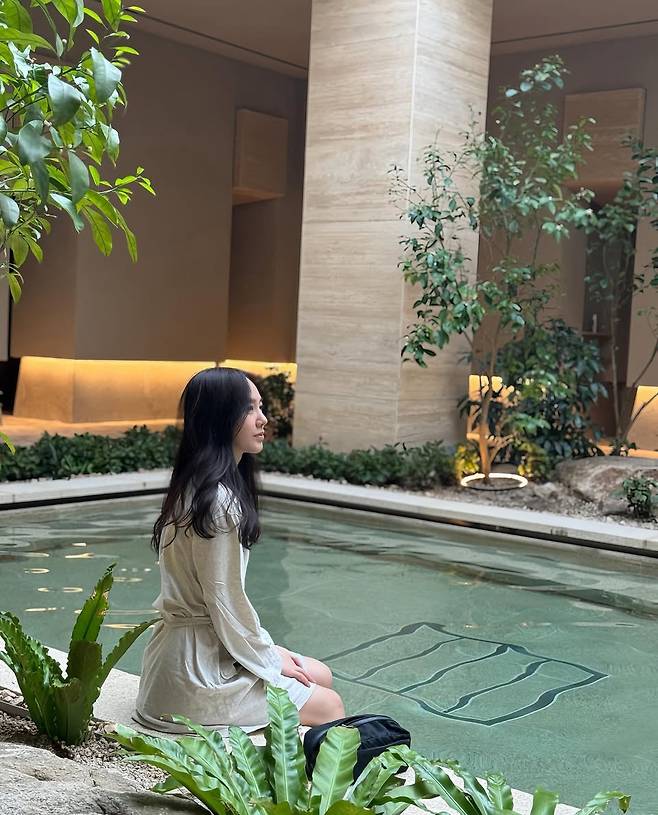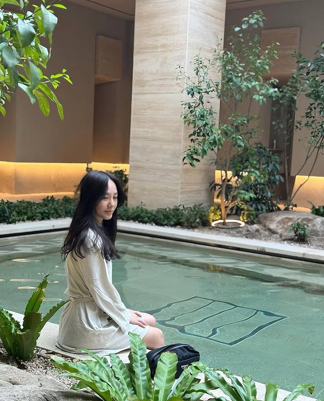 부드러운 광택감이 도는 라이트 그레이 로브 스타일의 원피스를 착용해 휴식과 여유가 깃든 무드를 연출했습니다.