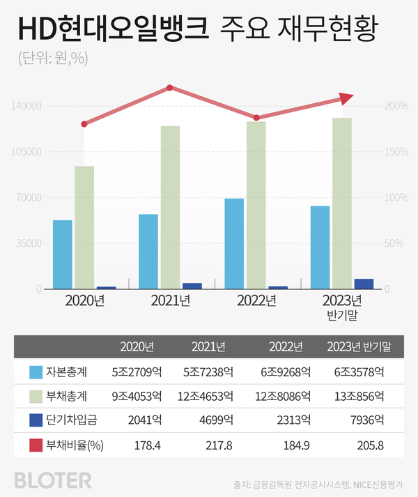HD현대오일뱅크의 현금 및 현금성자산은 2022년말 1764억원에서 올해 6월말 5208억원으로 집계됐다. 현금자산이 늘었지만 이는 차입에 따른 일시적인 현상이다. 같은 기간 단기차입금 규모도 덩달아 늘었다. 실제로 HD현대오일뱅크는 2022년 2313억원에 불과했던 단기차입금을 올해 6월 말 기준 7935억원으로 3.5배 가까이 늘렸다.