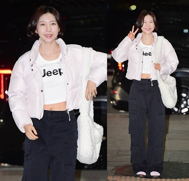 이날 주현영은 핑크 컬러의 숏패딩과 크롭 티셔츠, 카고 팬츠를 매치한 스타일리시한 빈티지 캐주얼 윈터룩으로 패션센스를 빛냈다.
