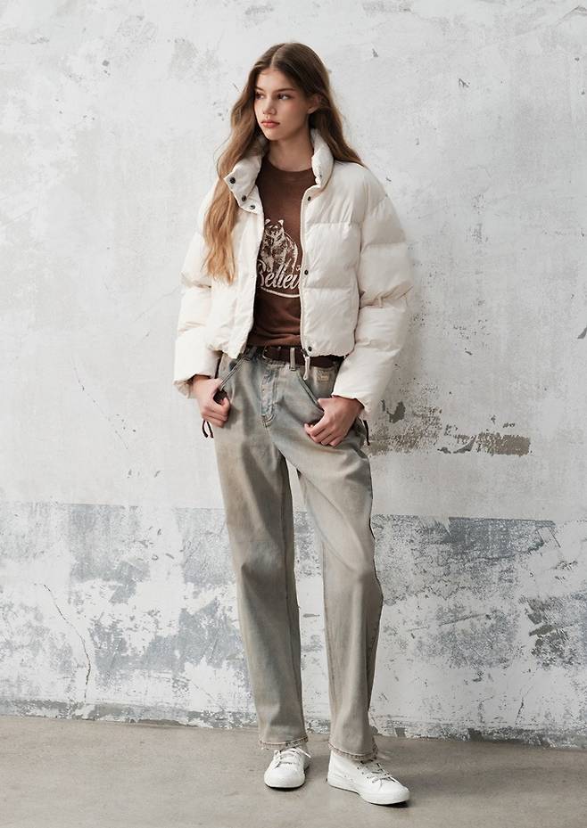 아메리칸 캐주얼 브랜드 '지프' 크롭 패딩과 크롭 티셔츠, 카고 팬츠로 연출한 스타일리시한 윈터룩