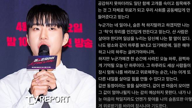 그러면서 "누군가는 네 일이냐, 슬픈 척하지 말라고 하겠지만, 나는 그 '척'이 우리를 인간답게 만든다고 믿는다"라며 "누군가에겐 한순간에 사라진 오늘 하루, 끔찍하게 기억될 오늘 단 하루다. 그 하루라도 세상 사람들이 잠시 멈춰 나를 바라보고 위로해 주는 순간, 나는 이게 또 다른 내일을 살아갈 힘을 만들 수 있는다고 믿는다"라고 밝혔다.