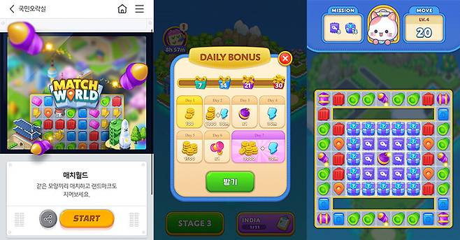 금번에 서비스를 개시한 2종의 게임은 가벼운 마음으로 즐기기 좋도록 만들어진 게임이다. ‘매치월드’라는 이름의 게임은 대중들에게 친숙한 3매치 퍼즐 장르를 취했다. 주어지는 미션에 따라 다양한 형태로 블록을 제거하면서 스테이지를 클리어해 나가는 친숙한 게임 방식이다. 차별점으로는 진행도에 따라 유저의 이름이 부여된 도시를 발전시켜 나가고, 또 다양하게 꾸밀 수 있도록 구성됐다는 점이다. 단순히 3매치 퍼즐만 플레이하는 것이 아니라, 새로운 성장의 재미까지 느낄 수 있도록 한 것이다.
