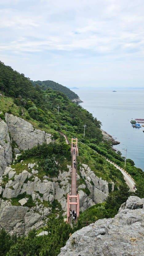 코스 중간에 있는 출렁다리도 빼놓을 수 없는 명소입니다. 44m 길이의 이 다리는 '돼지목'이라 불리는 험준한 협곡을 잇고 있어요. 다리에서 바라보는 기암괴석의 모습은 그야말로 절경입니다.