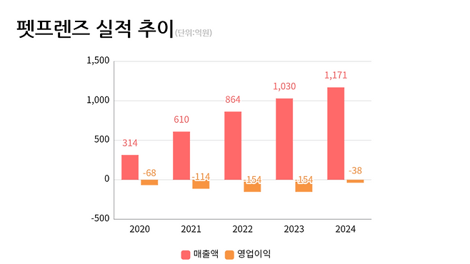 18일 금융감독원 전자공시시스템에 따르면 펫프렌즈는 지난해 매출액 1171억원, 영업손실 38억원을 기록했다. 매출액은 전년 대비 13.7% 증가했으며 같은 기간 영업손실은 75.0% 줄었다.