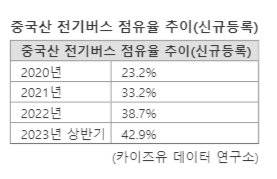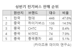현대차 빼면 中전기버스에 잠식 6일 본지가 카이즈유 데이터 연구소에 의뢰해 확보한 '전기버스 점유율'에 따르면 올 상반기 국내 전기버스 판매 '톱5'에 1위 현대자동차를 제외하고, 2~5위까지 전부 중국 브랜드인 것으로 나타났다.