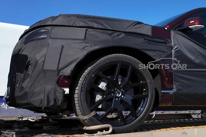 측면부에는 24인치 디쉬 타입 휠이 장착되었다. 코치 도어가 적용된 측면 B필러와 C필러는 블랙 하이그로시가 아닌 크롬 소재를 적용해 고급감을 높인 것으로 보인다. 이번 포착된 프로토타입에서 가장 핵심 사양은 코치 도어로, 이전까지 포착된 GV90 프로토타입은 모두 일반적인 도어를 장착한 모습이었다.