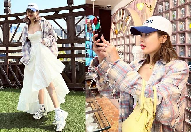특히 현아는 흰색과 파란색으로 배색된 캡 모자를 착용해 깔끔하고 스타일리시한 코디를 완성했습니다.