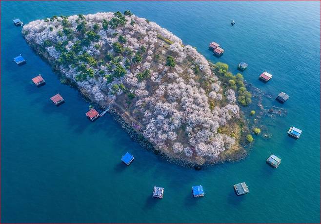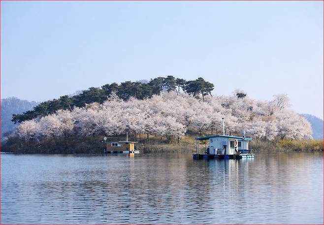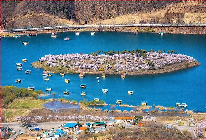 봄바람이 불면 섬 전체가 분홍색으로 타오르는 이 비경은 저수지 주변 둘레길 어디서든 감상할 수 있지만, 물 위를 유영하는 낚싯배 위에서 바라보면 마치 전설 속 무릉도원에 들어온 듯한 착각을 불러일으킵니다.