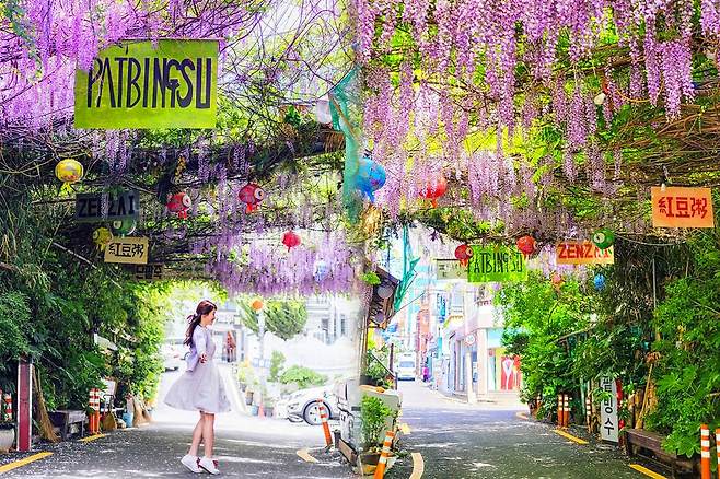 슬슬 더워지기 시작할 때쯤이라 남천녹차팥빙수에서 시원한 빙수를 맛보고 난 후, 신비롭고 이국적인 등나무꽃을 배경으로 멋진 작품을 남겨보세요. 동남아로 여행 온 기분을 느낄 수 있을 것입니다.