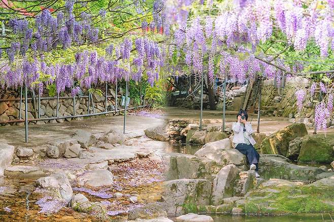 5월 초에 개화에 중순쯤에 지기 시작하며 등나무 꽃잎이 하나둘씩 지면서 꽃길이 형성될 때 특히 몽환적인 분위기를 연출해 인생 사진 출사지로 이름난 곳입니다.