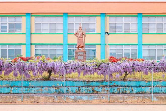 합도초등학교는 운산리에 위치한 공립 초등학교입니다. 알록달록한 색감으로 가득한 이곳은 5월이 되면 운동장 스탠드에 등나무꽃이 개화하기 시작하는데요. 풍성히 열린 등나무꽃이 아래로 늘어져 신비로운 광경을 선사합니다.