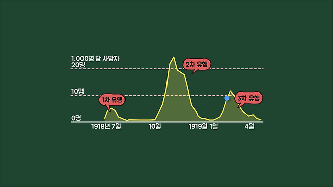 이 2차 유행은 1918년 12월을 기점으로 잦아들었으나 완전히 꺾이지는 않았고, 결국 1919년 3차 유행으로 이어집니다. 3차 유행 때는 이전과는 다르게 호주에서 시작해 유럽과 미국으로 전파됐는데, 호주가 방역을 완화하는 과정에서 많은 감염자가 나오게 된 것이고, 그나마 이때는 전쟁이 끝난 후라 확산 속도가 그렇게 빠르지 않았습니다.