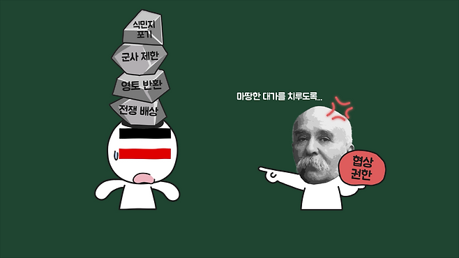 프랑스는 독일로부터 막대한 피해를 입었기에 복수심이 엄청났고, 클레망소는 엄청난 전쟁 배상금과 탄광 지대로 유명한 알자스-로렌 지방(Alsace-Lorraine)의 반환, 공군의 해산과 육군 병력의 제한, 식민지 포기 등 독일에 가혹한 조항을 강요했습니다.