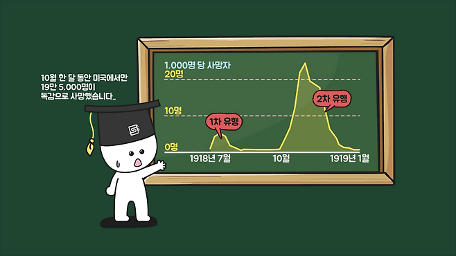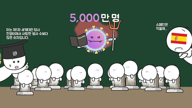 그런데 이 캠프에서 1918년 3월 독감 환자가 처음으로 발생한 뒤 신병훈련소의 의무실에 비슷한 증상의 환자가 100명이 넘게 드나들기 시작했습니다. 이렇게 시작된 독감은 병사들이 배를 타고 이동하면서 미국 동부 해안과 프랑스 항구도시로 퍼지기 시작했고, 프랑스 전역과 영국, 이탈리아, 스페인 등 전 세계로 번져갔습니다.