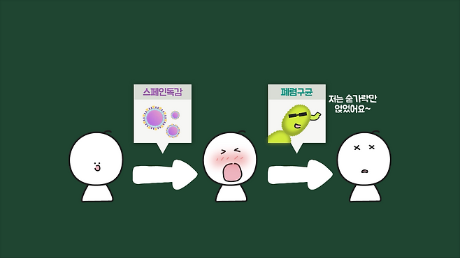 스페인 독감은 일반적인 계절성 독감과는 다르게 젊은 사람의 사망률이 매우 높았습니다. 환자들은 고열과 코피, 폐렴 등에 시달리다가 폐에 체액이 가득 찬 상태로 죽었는데, 인체가 병원체에 공격받으면 면역 시스템에서 사이토카인(Cytokine)이라는 물질을 만들어 염증 반응을 일으키는 방식으로 병원체를 제거합니다.