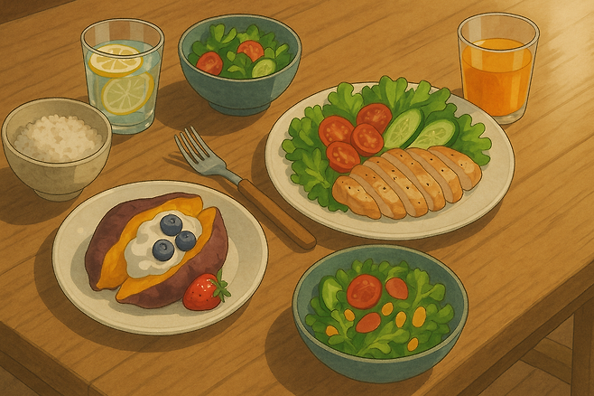 • 점심 : 현미밥 반 공기 + 닭가슴살 120 g + 시금치·토마토 샐러드