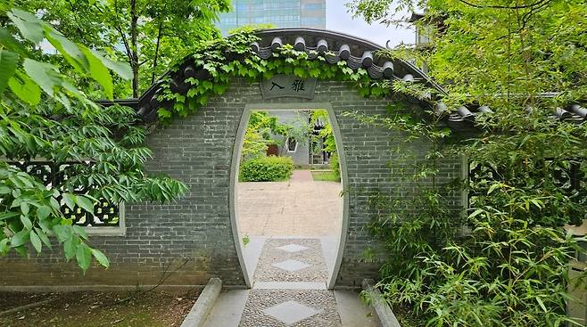 담장에는 각기 다른 모양의 누창과 통화 창이 뚫려 있어 정원의 내·외부공간을 서로 침투시켜 주어 공간의 깊이를 더해줍니다. 중국 최초의 조원서 <원야>에서는 원림을 조영함에 있어서 가장 중요한 것은 차경이라고 했습니다. 경치를 빌린다는 의미의 차경은 정원 안팎의 구분 없이 경관을 정원의 일부로 끌어와 경관의 한 조성 부분으로 삼는 것을 의미합니다.