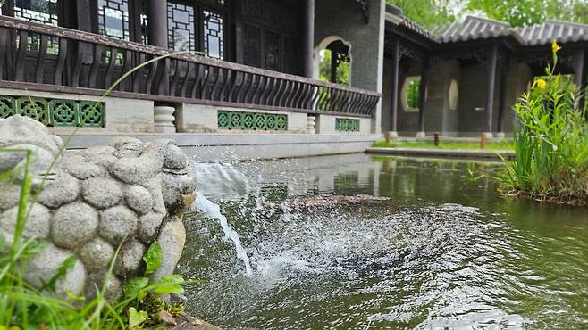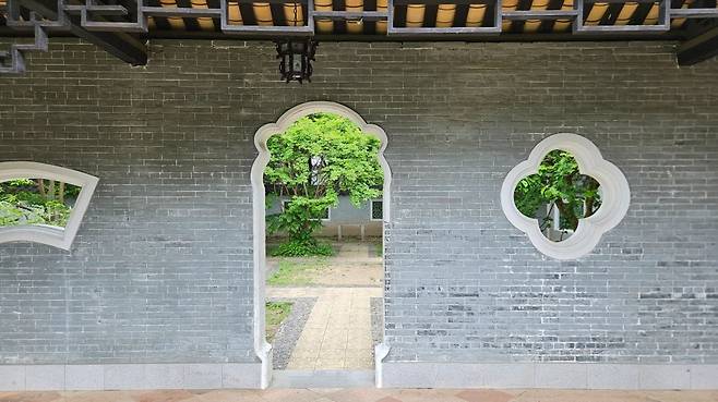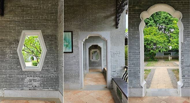 담장에는 각기 다른 모양의 누창과 통화 창이 뚫려 있어 정원의 내·외부공간을 서로 침투시켜 주어 공간의 깊이를 더해줍니다. 중국 최초의 조원서 <원야>에서는 원림을 조영함에 있어서 가장 중요한 것은 차경이라고 했습니다. 경치를 빌린다는 의미의 차경은 정원 안팎의 구분 없이 경관을 정원의 일부로 끌어와 경관의 한 조성 부분으로 삼는 것을 의미합니다.