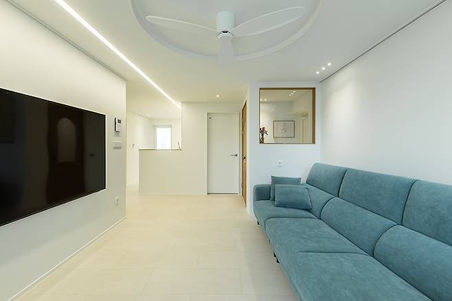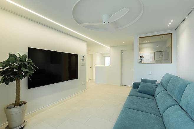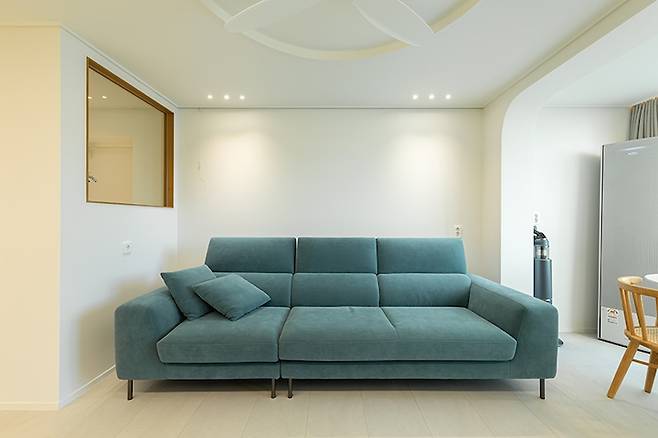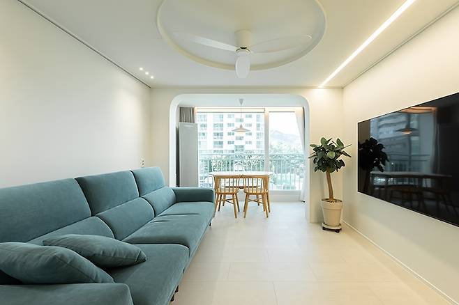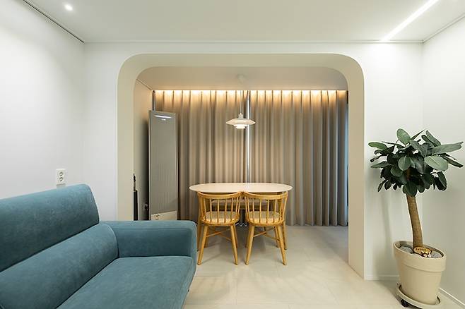 그래서 직각 디자인과 아치 디자인 중 조금 더 부드러운 느낌의 아치로 디자인했습니다. 그리고 거실부터 주방까지 라인 조명으로 조도를 확보하였고요. 주변은 2인치 다운라이트와 커튼박스 간접등으로 은은한 거실을 만들었습니다.
