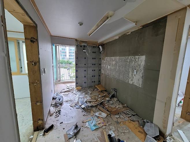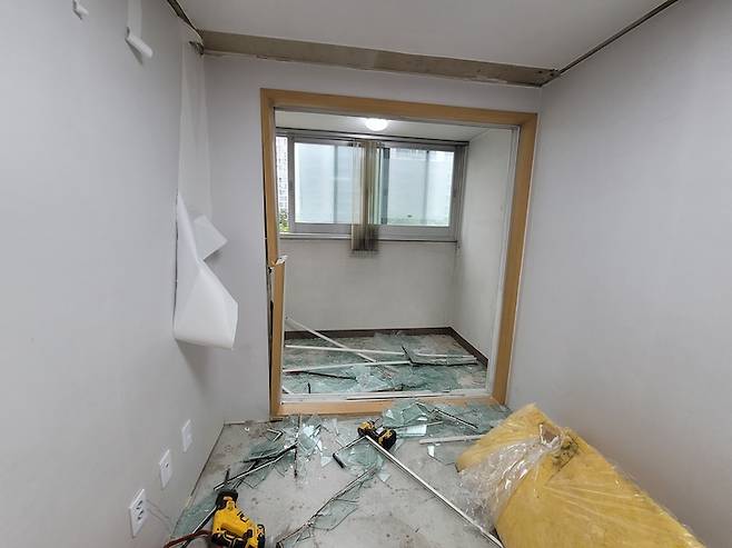 거실을 조금이라도 넓게 사용할 수 있도록 확장 공사를 진행하였습니다. 하리(샷시 날개와 위쪽 벽)는 내력벽으로 철거가 불가한 상태였어요.
