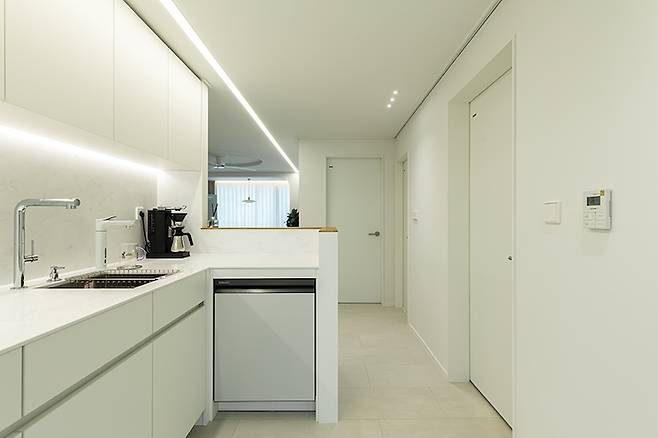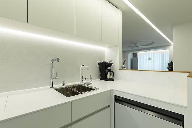 20평대 2BAY 구조로 주방이 넓지 않아 ㄱ자의 형태로 레이아웃을 잡았어요. 식기세척기를 설치할 수 있도록 공간을 만들고, 거실에서 보이지 않도록 가벽을 설치하여 아늑한 주방 공간을 만들었습니다. 파티션(가벽) 위는 현관 중문과 동일한 우드 필름으로 포인트를 함께 했습니다.