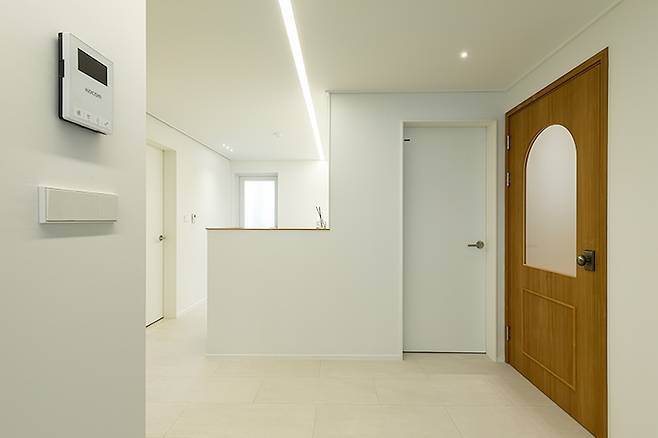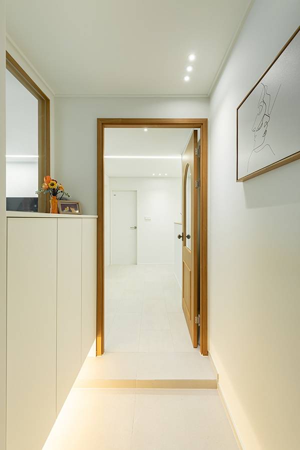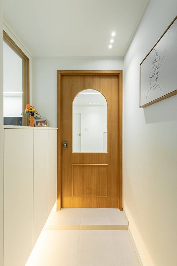 현관은 두 가지의 추천 레이아웃이 있었는데요. 가벽으로 신발장을 높고 크게 제작하는 방법과 유리 파티션을 제작해 하프 신발장으로 디자인하는 방법 중 두 번째 방법으로 결정하셨습니다. 중문은 아치 디자인 중문입니다. 파티션 유리 쪽에도 동일한 우드 필름으로 포인트를 주었습니다.