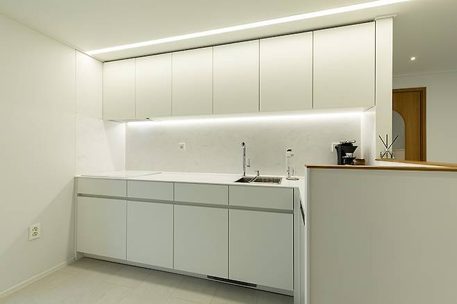 상부장의 아래쪽에는 간접조명을 넣었고, 오로라 무늬의 인조대리석을 미드웨이까지 시공하여 끊김 없는 주방을 제작하였습니다.