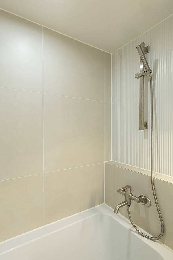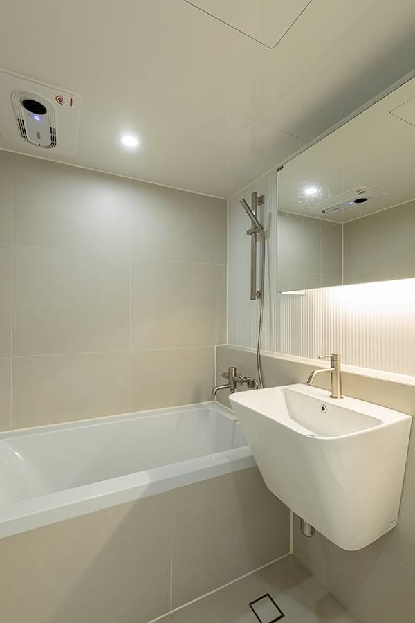 젠다이 시공을 통해 선반이 필요 없는 공간을 만들고 반신욕을 좋아하는 클라이언트의 요청에 따라 욕조를 넣었습니다. 욕조 옆 부분은 에이프런(욕조와 같은 소재)으로 시공하지만 타일로 마감하여 고급스러움을 주었어요.