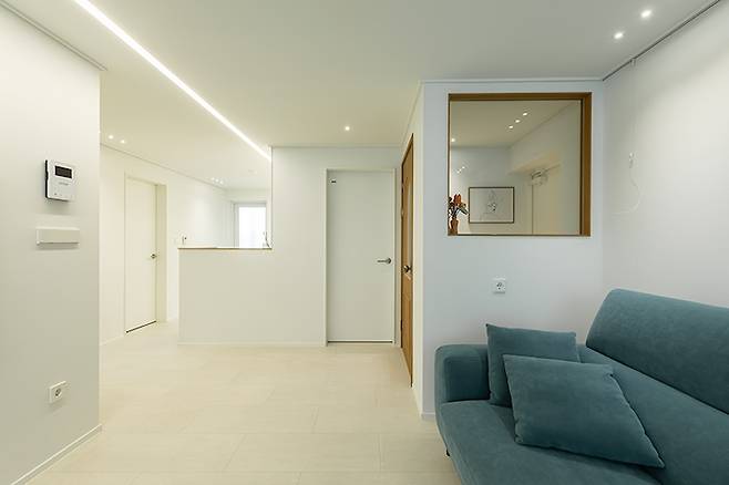 소파 뒤쪽 벽에는 매립 액자 레일을 시공하였어요. 못을 사용하지 않고 그림과 사진을 깔끔하게 설치할 수 있도록 하였습니다.