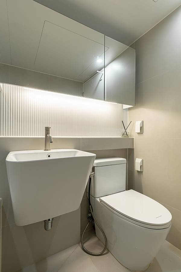 전체적으로 베이지색 600*600 포세린 타일을 사용하고 정면 벽에는 라운드 템바보드 느낌을 주는 도기질 타일을 시공하여 따뜻한 느낌의 욕실을 만들었습니다.