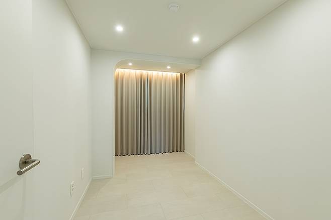 입구에 위치한 작은방도 확장 공사를 통해 공간을 확보하고 서재 겸 손님방으로 계획했습니다. 거실과 동일하게 하리(내력벽)을 철거할 수 없었기 때문에 한쪽으로 라운드(아치)를 디자인하고 커튼박스 간접 조명으로 아름다움을 더했습니다.