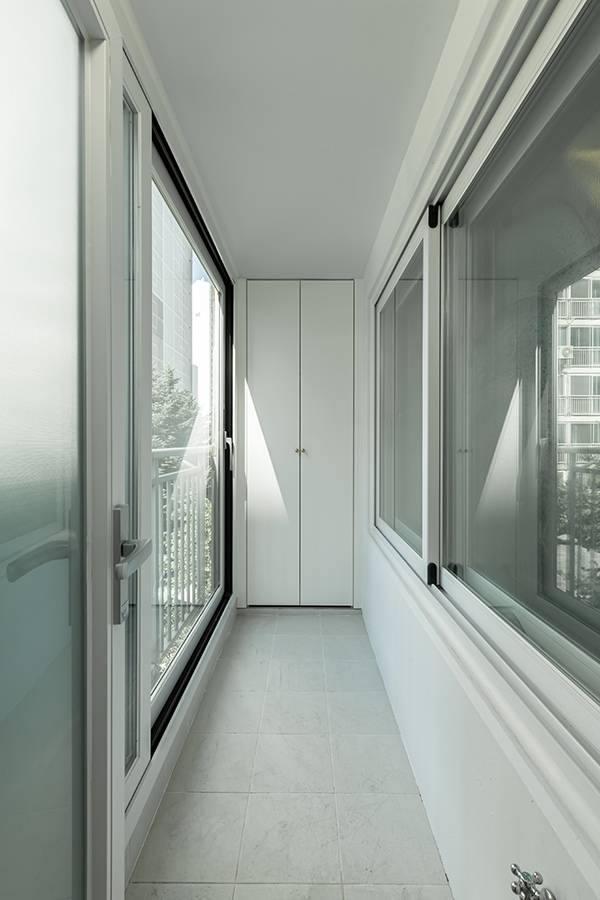 확장 공사를 하여 발코니가 좁아졌는데요. 기존의 창고장은 철거 후 깨끗하게 페인트 작업과 타일 공사를 하고 창고 수납장을 새로 제작하였습니다.