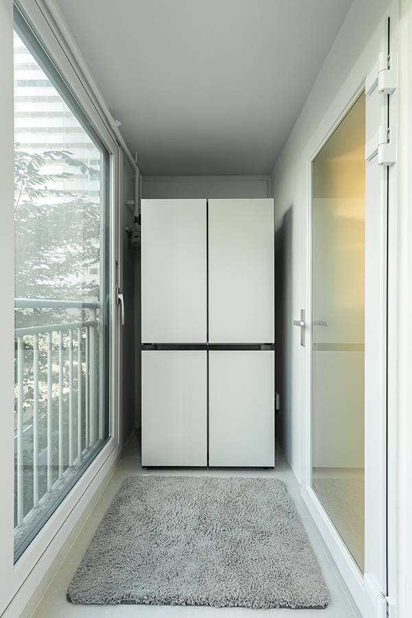 다용도실(뒷베란다)에 냉장고를 두었어요. 확장을 추천드렸지만 비용 대비 공간이 그리 넓어지지 않아 진행하지 않았습니다. 세탁기를 올려서 설치할 수 있도록 타일 시공 시 단올림 시공을 하였습니다.