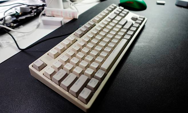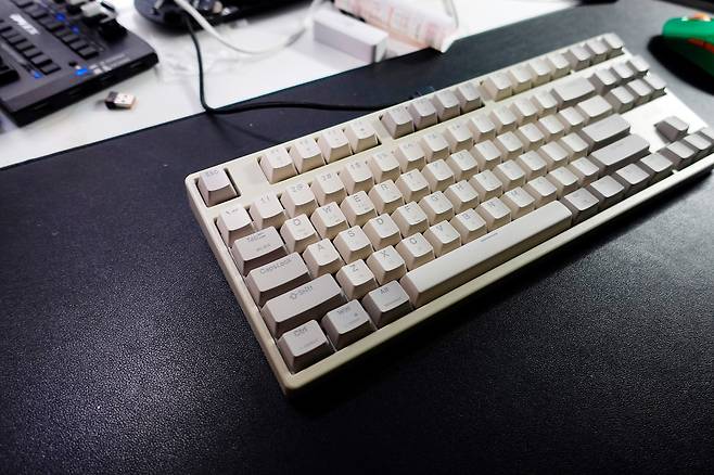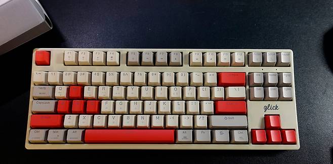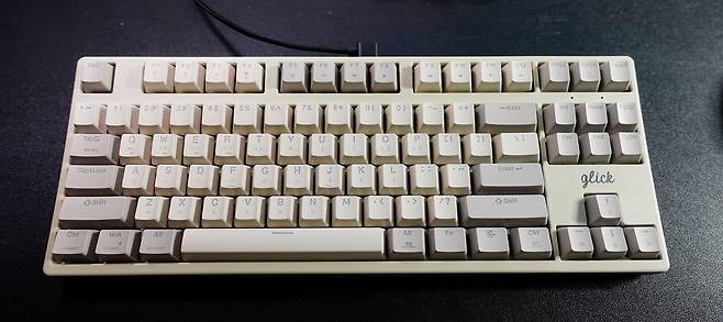요즘 무척이나 많이 사용하는 87 배열의 사이즈이며, 기본으로 장착되어 있는 키배열은 아이보리와 그레이 키캡으로 구성이 되어 있습니다.