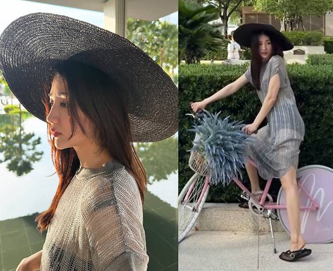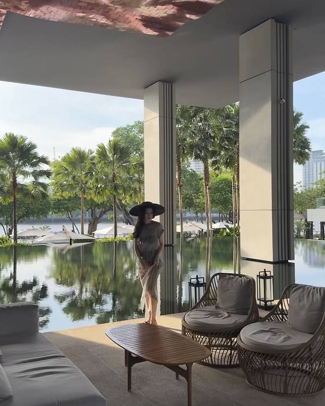 박하선이 청량한 리조트 풍경 속에서 한 폭의 그림 같은 비주얼을 자랑했습니다.