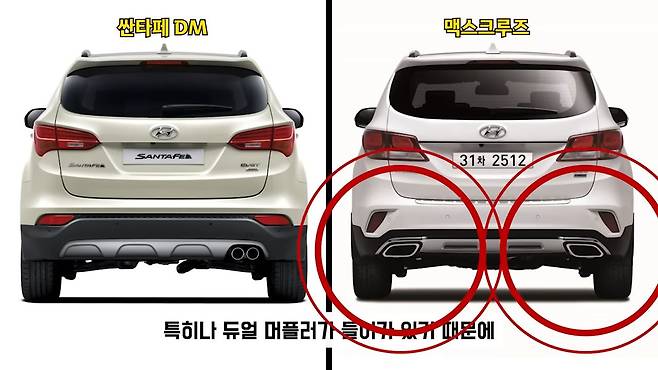 또 그나마 다행인 건 후면부 디자인은 많이 다르거든요. 특히나 맥스크루즈에는 듀얼 머플러가 들어가 있기 때문에 싼타페 DM과 그나마 차별화는 확실히 되는 것 같아요.
