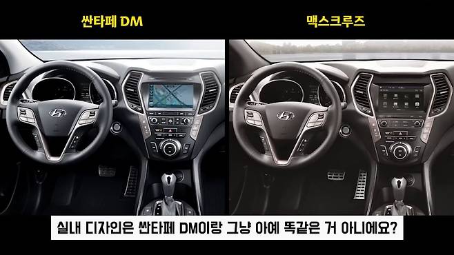 외관은 그렇다 치는데, 실내 디자인은 싼타페 DM이랑 그냥 아예 똑같아요. 완전 판박이라고 생각합니다. 다른 게 없어요. 중고차 살 때 엔카에서 보면 싼타페와 맥스크루즈의 실내 디자인이 큰 차이가 없어서 헷갈렸을 때가 있었습니다. 싼타페 롱바디 모델이 맥스크루즈이기 때문에 그만큼 부품 호환이 잘 되니까 좋다고 생각합니다.