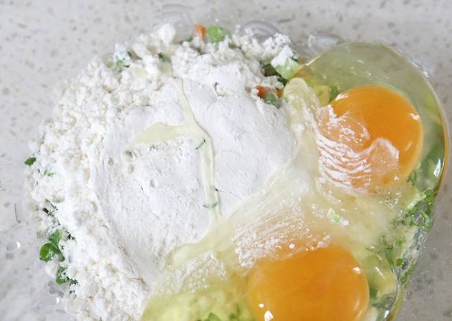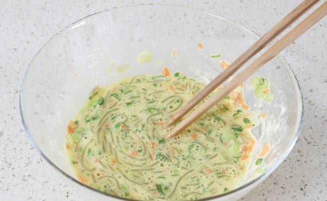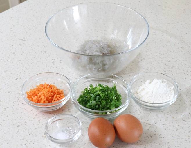 잘게 자른 당면에 준비한 재료들을 모두 섞어서 되직하게 반죽을 만들어요. 약간 매콤하게 드시고 싶다면 청양고추 추가해서 넣어주세요.