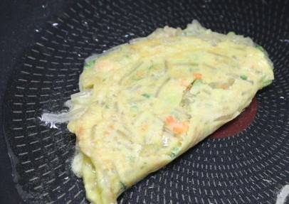 달궈진 팬에 계란물 한국자 정도 올린다음 너무 두껍지 않도록 넓게 펼쳐 줍니다.