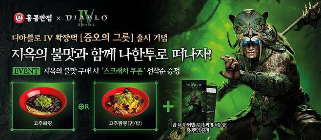내일 10월 8일부터 전국 300여개 홍콩반점 매장*에서 고추짜장, 고추짬뽕, 고추짬뽕밥 세 가지 ‘지옥의 불맛’ 메뉴를 맛볼 수 있으며, 해당 메뉴 구매 시 게임 내 아이템을 획득할 수 있는 스크래치 쿠폰을 선착순으로 증정한다.