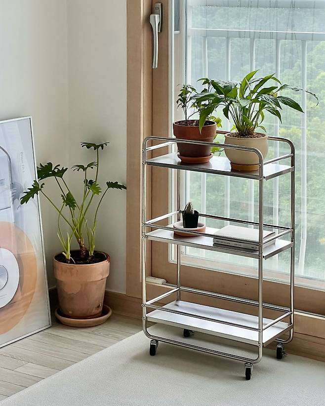거실 앞 쪽엔 이동식 트롤리를 뒀어요. 식물 키우는 걸 좋아하는데, 창문 앞에 쪼로록 화분을 두니 매번 청소기 돌리기도 힘들고 정리가 덜 된 느낌이 나더라고요. 그러던 중 가격 부담 없는 트롤리를 발견했습니다. 지금까지 후기는 기대 이상으로 바퀴도 잘 굴러가고, 수평도 잘 잡힌다는 거예요. 덕분에 식물들이 창문 바로 앞에서 햇빛 받으며 무럭무럭 크고 있답니다.