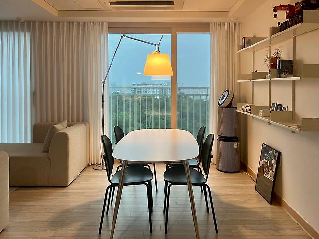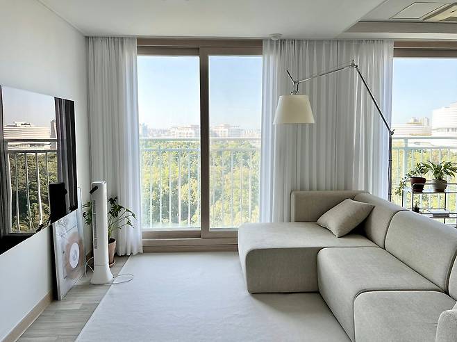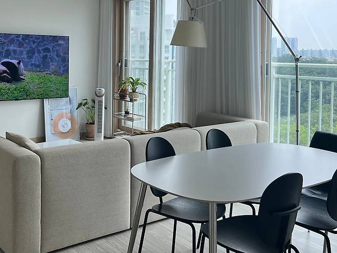 해가 잘 드는 날도, 비가 오는 날도 항상 커튼을 열어두고 있어요. 이 집을 선택한 이유가 시원한 숲 뷰와 거실이 정남향이라는 점이었는데, 지낼수록 역시 이 점이 아주 만족스러워요.