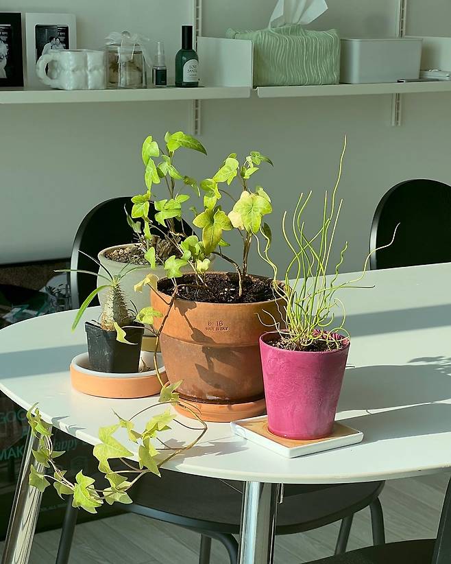 다들 선반에 예쁜 오브제를 올려두시던데, 저는 예쁜 오브제가 많이 준비되지 않아서 우선은 제일 좋아하는 것들로 채웠어요. 속초에서 찍은 셀프 웨딩 폴라로이드 사진, 좋아하는 책들, 화분들을 올려두고 있어요. 종종 친구들에게 받는 선물도 올려둔답니다. 좋아하는 것들로 채운 공간이어서 그런지 오며 가며 볼 때마다 기분 좋은 에너지를 받아요.