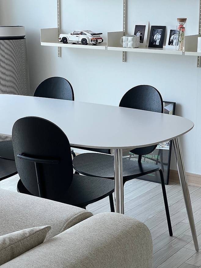 식탁 의자는 위키노 티체어로 맞췄어요. 소파 보러 간 비아인키노 쇼룸에서 우연히 앉아봤는데 꽤 편안하고 가벼워서 집에 와서도 계속 떠오르더라고요. 블랙 컬러가 많이 튈까 염려했는데 거실이 마냥 밝지만은 않게, 나름의 분위기를 정적으로 잡아주는 느낌이라 꽤 잘 어울려요.