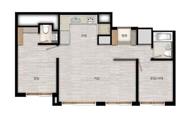 저희 집은 아파텔이라고 불리는 주거형 오피스텔이에요. 기존 구조는 방 3개와 욕실 2개로 이루어진 19평 쓰리룸인데, 거실 옆에 붙어있던 방 하나를 터서 거실이 넓게 확장되어 있었어요. 저희 부부는 아이 없는 예비 신혼부부라서 방이 많이 필요 없었고 평수 대비 거실이 넓게 빠진 구조라 마음에 들었습니다.