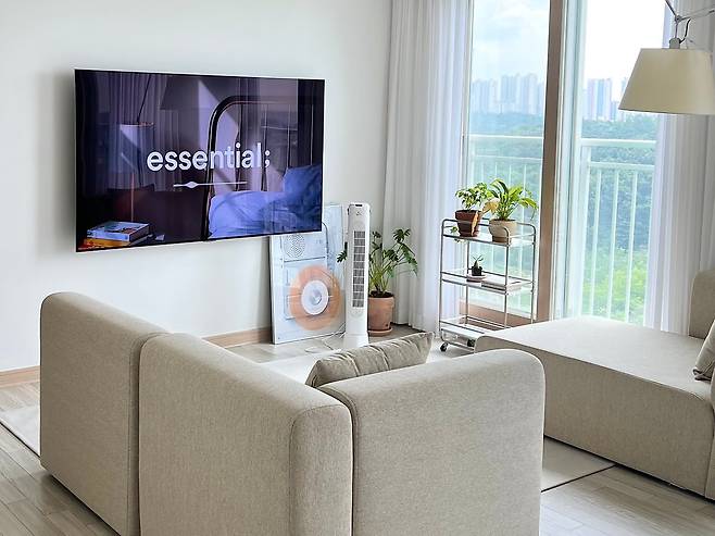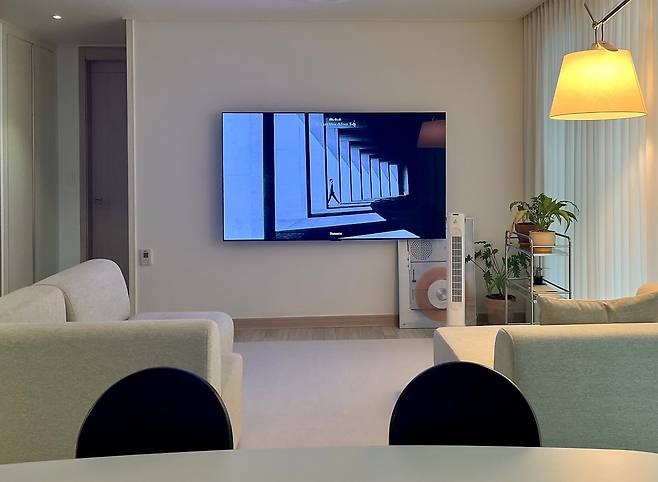 TV는 LG전자 올레드 evo TV 77인치를 구매했습니다. 전에 살던 집도 거실 창이 넓어서 햇빛이 많이 들어왔는데 TV 화면에 빛이 반사되면 화면이 잘 안 보이더라고요. 특히 저희는 영화를 많이 보는데 유독 넷플릭스 콘텐츠들은 비교적 더 어두운 편이라서, 이번 TV는 꼭 빛반사가 적은 제품으로 알아봤고 4K(UHD) 사양인 올레드 TV를 골랐습니다.