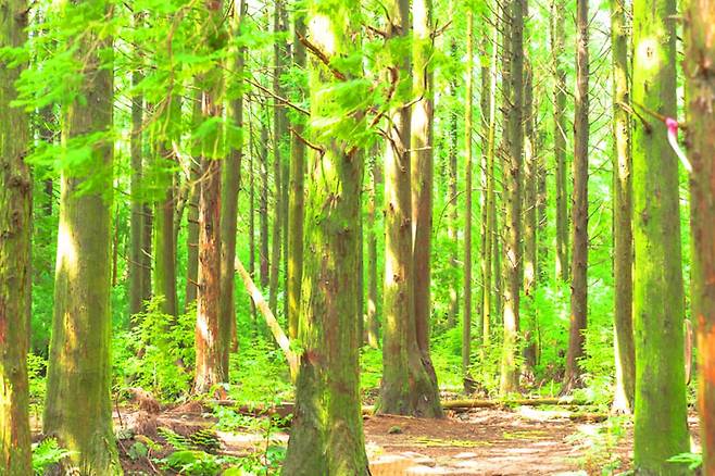 머체왓숲길에 들어서면 빽빽이 들어선 삼나무와 편백나무가 온몸을 감싸는 듯한 느낌을 줍니다.
